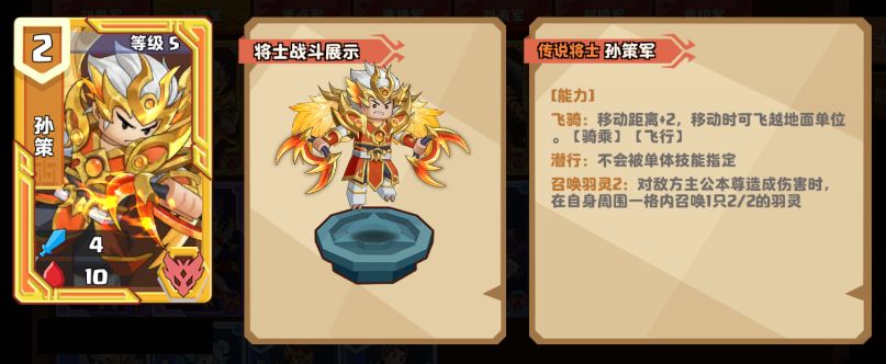 2.孙策:最强传说快攻【骑乘】将士之一,只要伤到敌方主公,就能召唤“小黄鸡”占领敌方召唤区。每回合持续造成伤害的同时,敌方的还非常难解决有【潜行】的孙策。