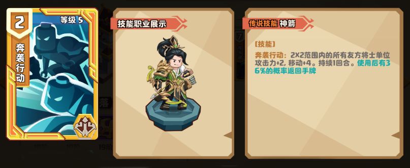 等级2的【奔袭行动】:2x2范围内的所有友方将士单位攻击力+2,移动+4。持续一回合。使用后有6%的概率返回手牌;