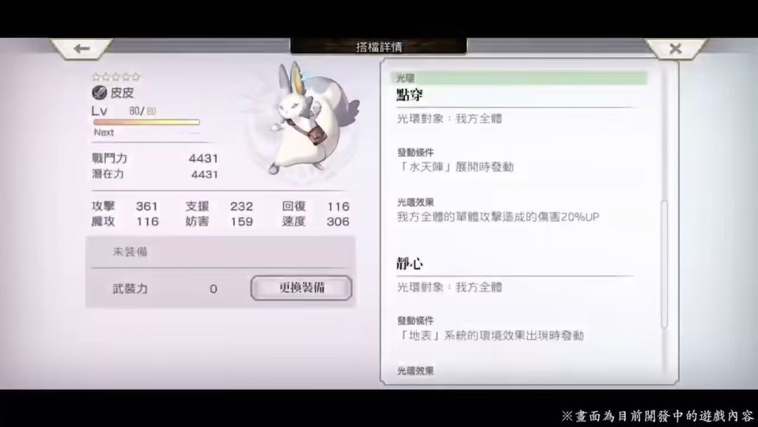 战斗开始时,若前排有四个【水】角色,进入【辉耀】状态,前排时技能倍率翻倍,使用任何伤害技能均会退出状态;退出状态后,仅能通过宠物技能重新进入