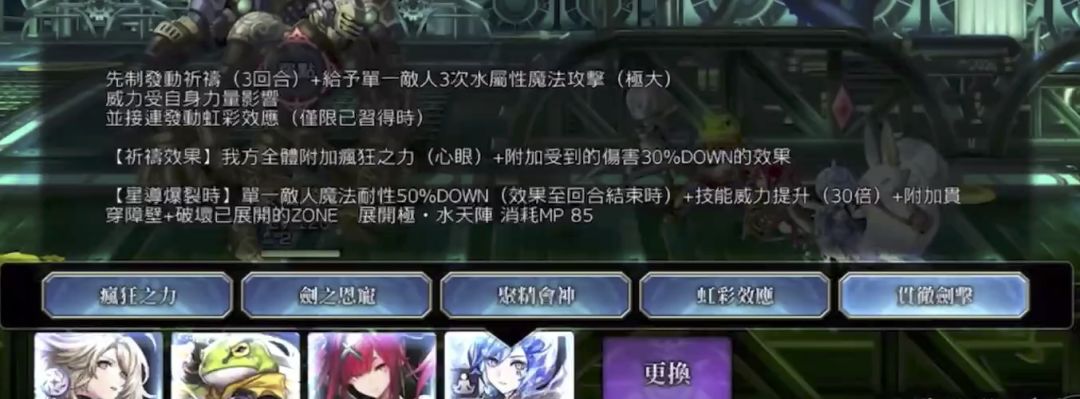 给予单一敌人3次水属性魔法攻击(特大)+HP最大时造成的伤害增加(3倍)+我方全体HP回复3000+暴击率100%up+魔法暴击率100%up(3次行动)