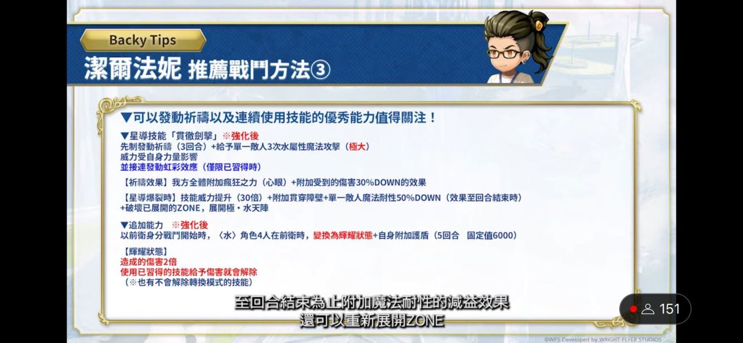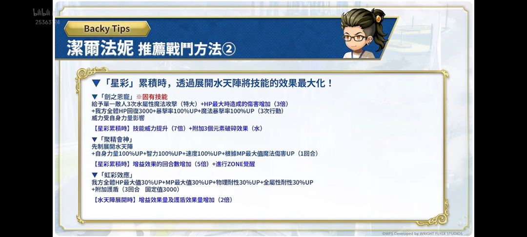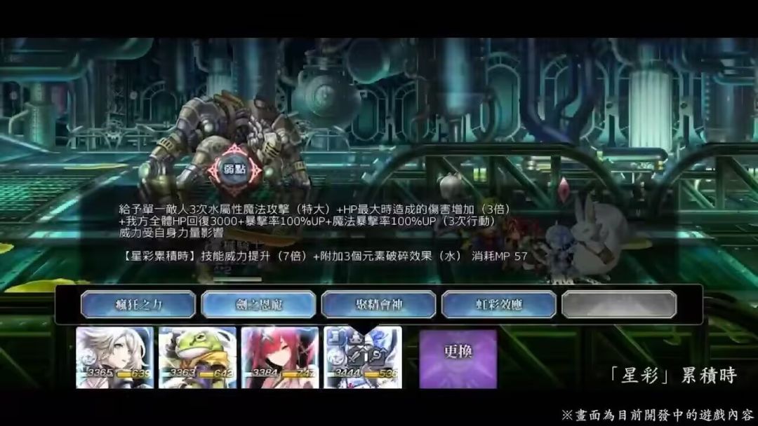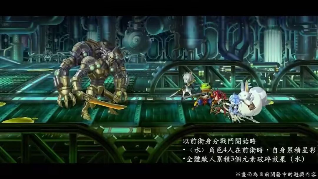 以前卫身份战斗开始时,【水】角色4人在前卫时,自身累积星彩,全体敌人蓄积3个水破碎