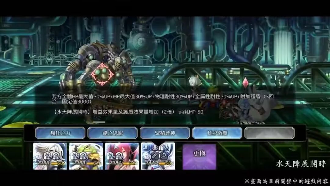 我方全体HP最大值30%up+MP最大值30%up+物理耐性,全属性耐性30%up+附加护盾(3回合 固定值3000)