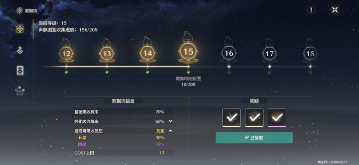 世界等级推到到30数据坞15级可以刷金色声骸(划重点)数据坞15级约需要全员紫声骸,可以在数据坞查看追踪刷满声骸,异想活动可以拿2个自选金声骸缓解压力