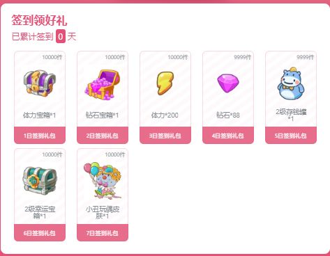 论坛签到即可领取体力、钻石及各种宝箱,签到满7天还有小丑玩偶皮肤。
