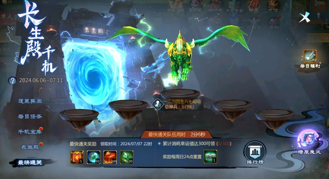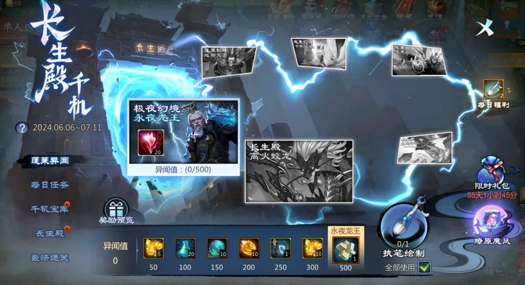 活动共分五个部分:蓬莱异闻、每日任务、千机宝库、长生殿、最快通关。下面一起来看看每个活动的详细说明吧~