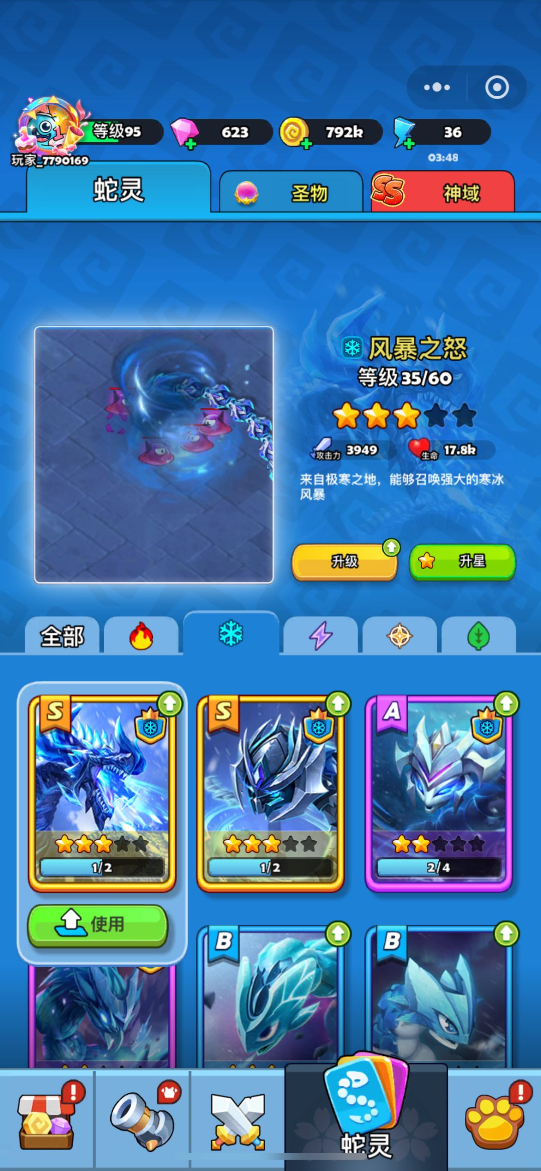 微信小程序的游戏,51无聊,刷了一会发现还可以,断断续续的玩,坚持零氪,砖石全部存起来抽装备,装备是提升层数、关数最直接最有效果的一种方式,等6件套集齐,就可以转为抽蛇,其实2件套集齐基本就可以起飞了。零氪游戏最重要是要心态好,千万不能急,打不过就休息,第二天继续,蛇绿叶子属性抽的第一条S蛇,就是哨箭,基本可以用到现在,基本玩了29天都是用它为主,特别适合挂机时自动攻击,就差圣光系没抽到s级的蛇,有一点点遗憾吧,其他基本都2条s级,反正零氪,也就无所谓竞技场排名了,就这样吧,感谢遇见,后会无期!