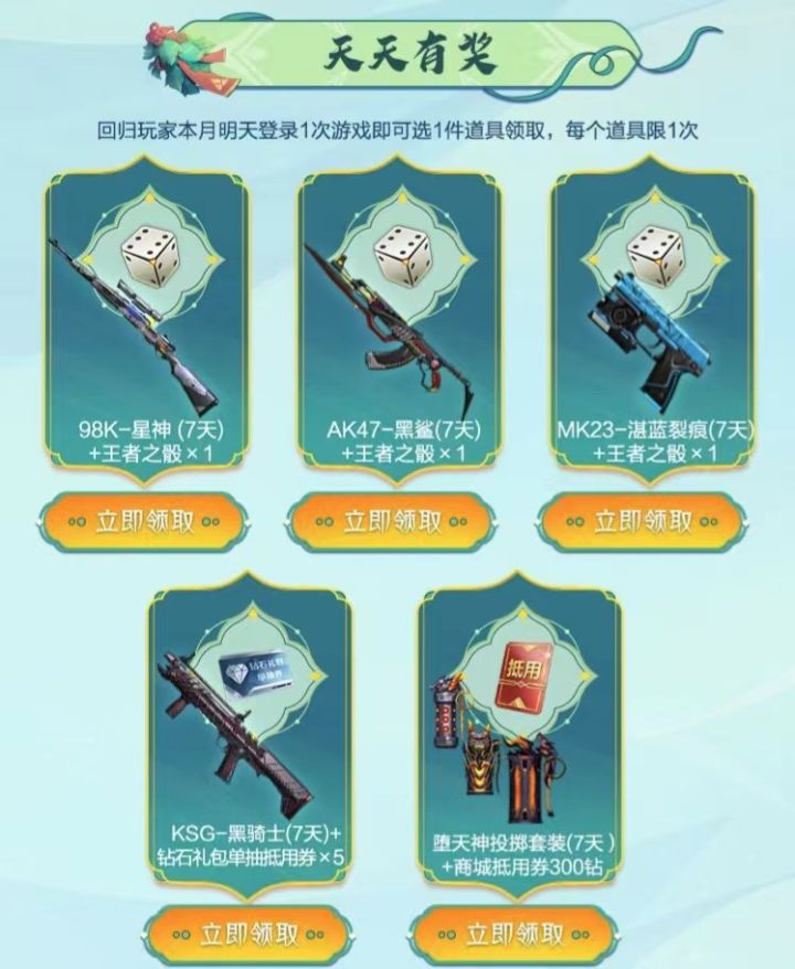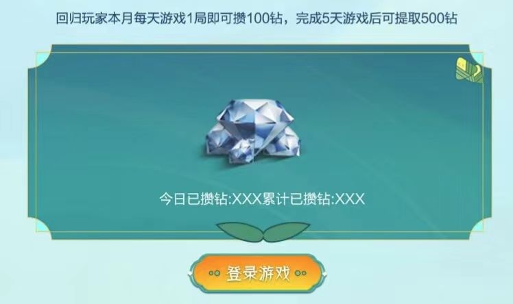 回归玩家本月每天游戏1局即可攒100钻,完成5天游戏后可提取500钻
