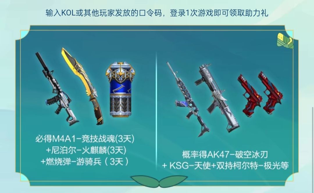 输入KOL口令码:【cfmocyq】,登录1次游戏即可领取助力礼