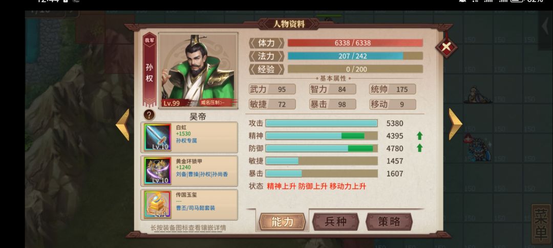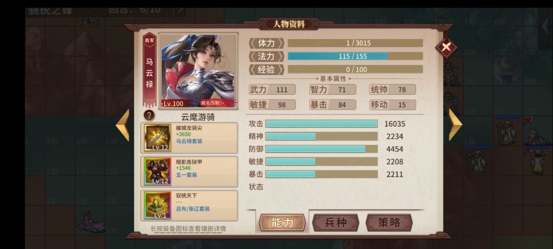 左慈本体给马云禄必中,孙权给马云禄大再动,马云禄冲锋联排飞熊后,到妖术上方给自吃全状态回恢复药