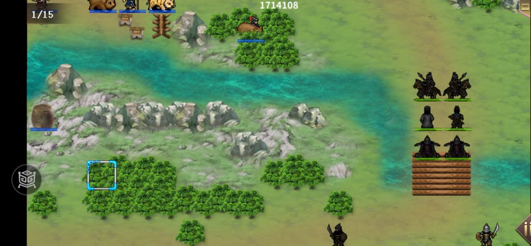 第十二回合,图没有了,主要是上面2个走位,看小地图吧,就是把孟获引过去,不然要么孟获死太快,要么骑手顶不住。控制孟获血量和血量。算好孟获每回合还要会40点血,一次大概40-60伤害。目标就是拖到15回合结束,可能有更好的方法,我试下来反正这个正好。