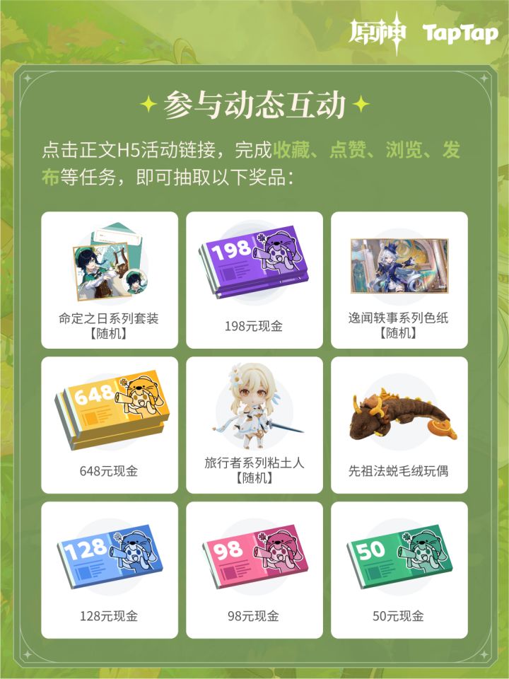 即有机会抽取旅行者系列粘土人、先祖法蜕毛绒玩偶、648元现金等丰厚奖励