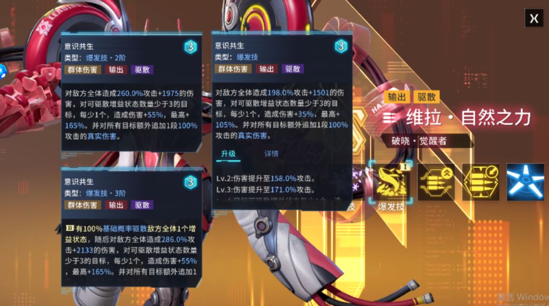 维拉·自然之力的核心爆发技:对敌方全体造成198.0%攻击+1501的伤害,对可驱散增益状态数量少于3的目标,每少1个,造成伤害+35%,最高+105%。并对所有目标额外追加1段100%攻击的真实伤害。