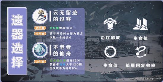 主词条方面,头部和手部为固定的生命值和攻击力属性,躯干选择治疗量加成,脚部选择生命值,位面球选择生命值,连结绳选择能量回复效率。