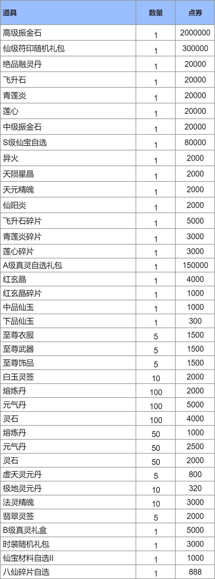 绝品融灵丹,飞升石,青莲炎,莲心,中级振金石,天陨,太阳,天元,飞升碎片,莲心碎片,红玄晶及其碎片,时装随机礼包。