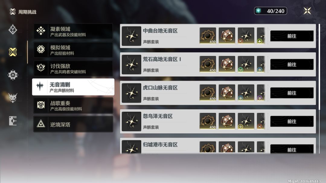 2、无音区挑战:通过清理无音区,使用体力获取奖励后,玩家能过获得特定套装包含声骸。但获取获取声骸的种类品质有一定限制——种类只能获得已拥有的声骸种类,比如获取过石头人声骸可用刷出石头人的,没获取过就不会出现石头人的声骸。