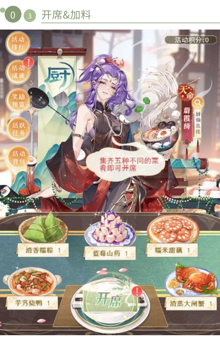 当五种菜肴制作好就可以【开席】啦,每次开席都会获得一定的活动积分哦,每场宴席时间持续2个小时,当宴席中的五种菜肴全部被吃完和被倒掉,那么宴席会提前结束