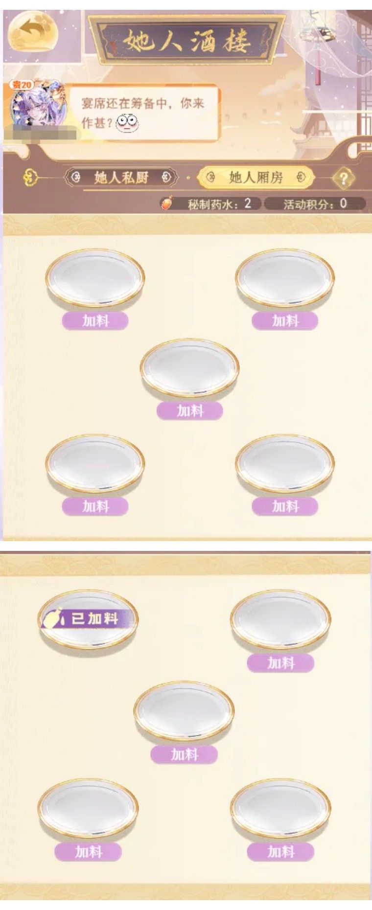 点击未开席的好友或者贤戚、仇人、随机玩家的厢房,可在她们菜中加料,加料需要消耗一个秘制药水