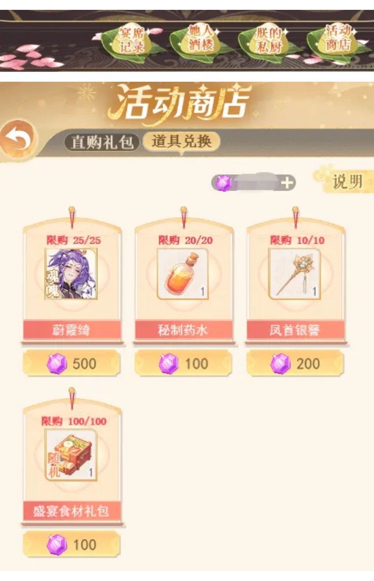 (1)在【活动商店】处的【道具兑换】处,兑换购买盛宴食材礼包,打开后可随机在清新粽叶、铁棍山药、新鲜莲藕、肥美鸭肉、鲜活大闸蟹这五种食材中获得一种食材