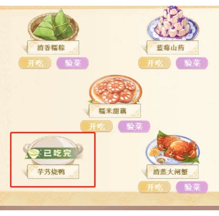 验菜需要消耗1个凤首银簪,若该餐盘没被加料,验菜则该菜肴变为“已吃完”状态,且宾客和设宴者双方获得活动积分;若该餐盘已被加料,验菜则该菜肴变为“已倒掉”状态,且宾客和设宴者双方获得活动积分