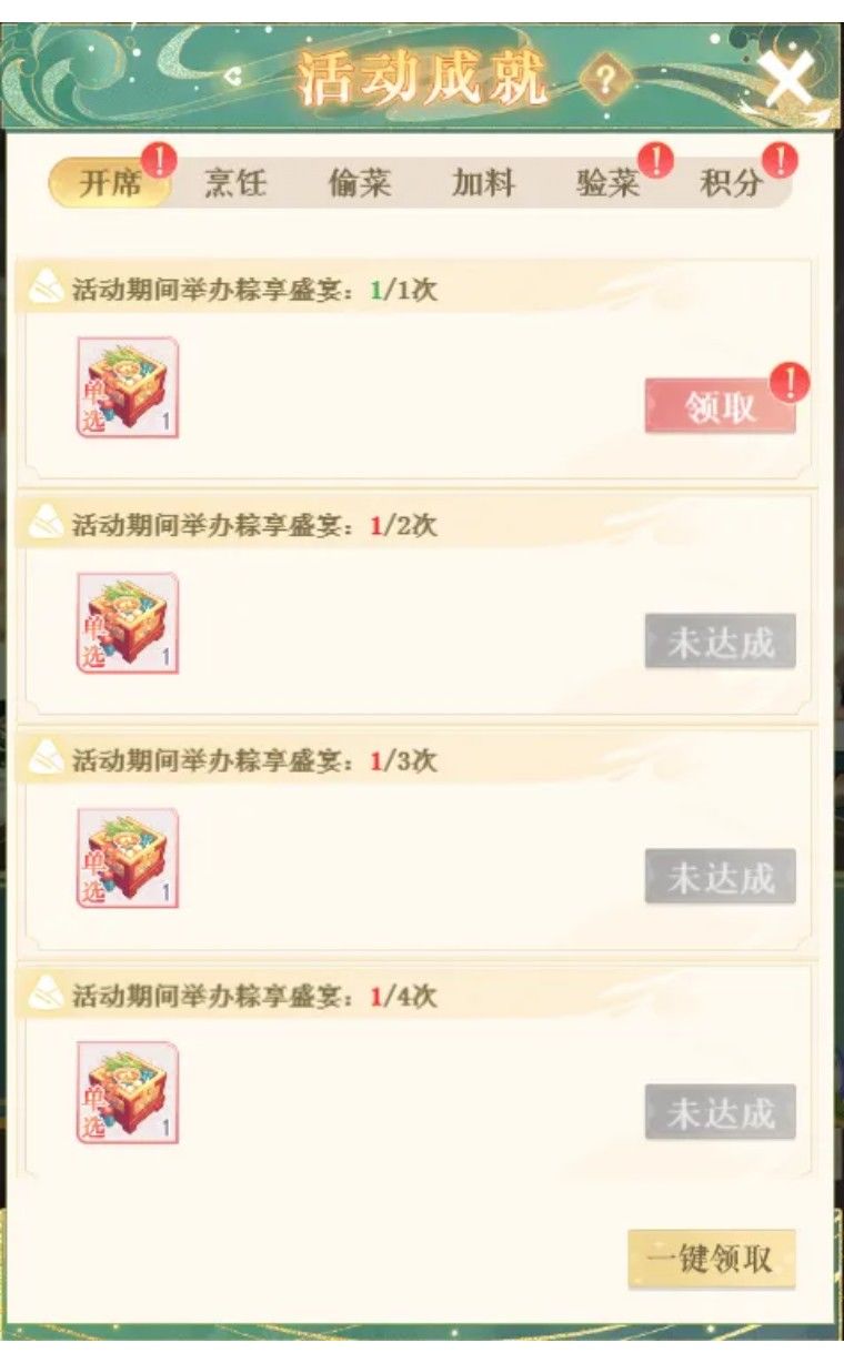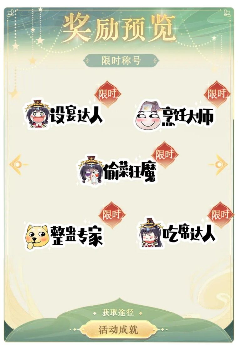2、活动期间,达成相应的活动成就,可获得粽享盛宴宝箱、蔚霞绮信物山海烩碎片、限时称号“设宴达人”、限时称号“烹饪大师”、限时称号“偷菜狂魔”、限时称号“整蛊专家”、限时称号“吃席达人”等奖励