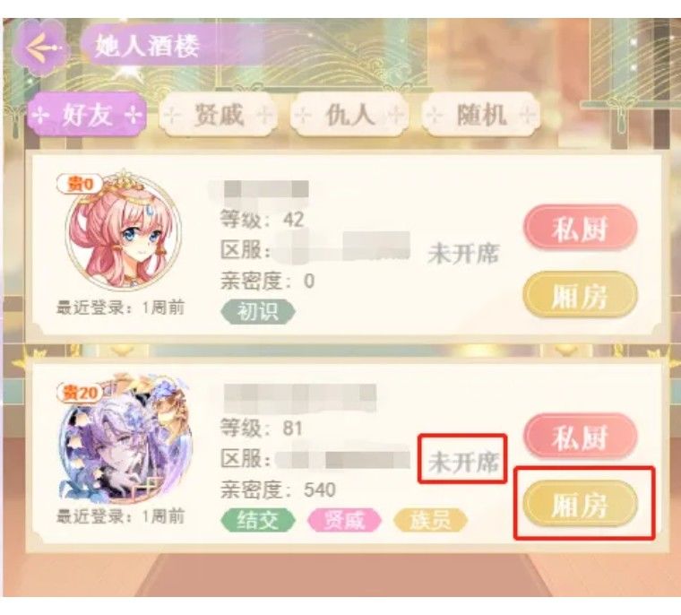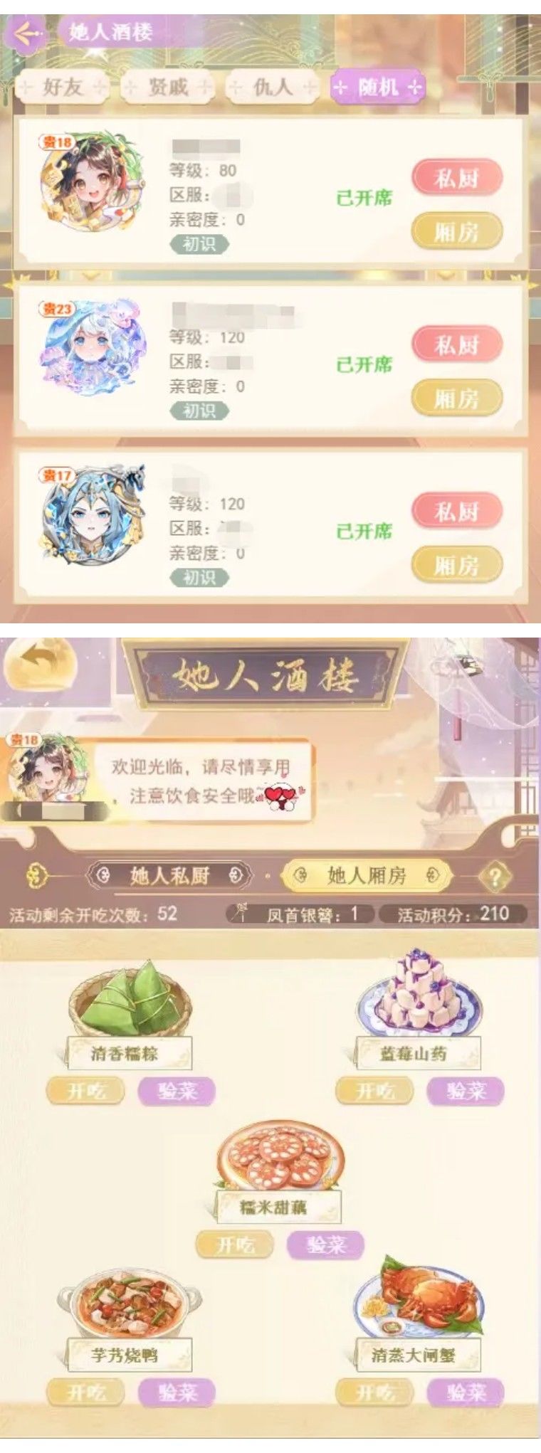 点击【她人酒楼】,若显示“已开席”,进入对方【厢房】,就可以进行吃菜或者验菜啦