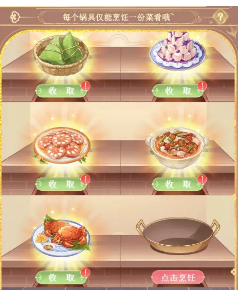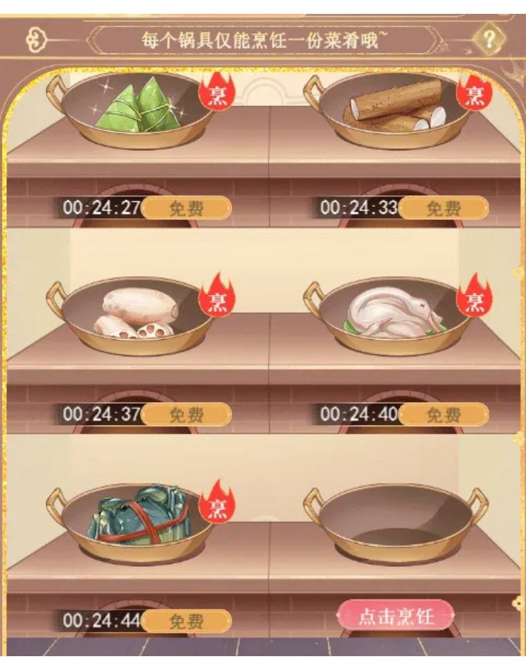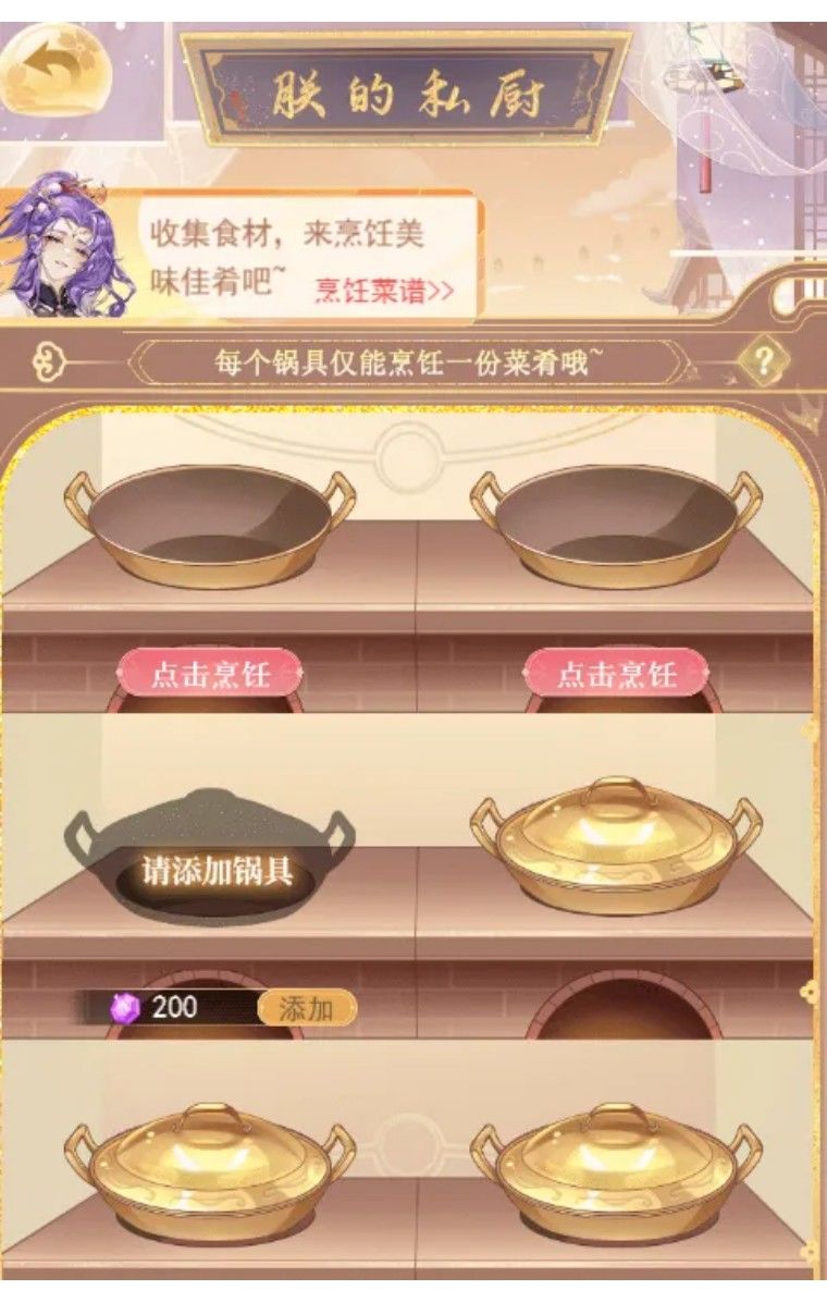 1、此处,共有6个锅具,其中四个需要消耗紫晶币添加;每个锅具只能制作一种菜肴,每种菜肴需要消耗一定数量的食材进行烹饪,且每种菜肴都有烹饪时间