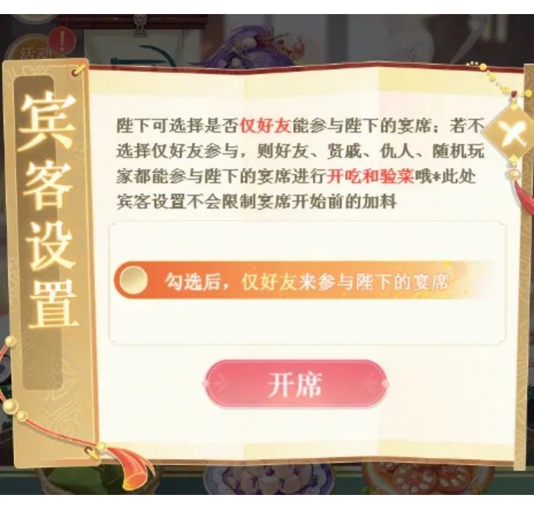 开席的时候还可设置宾客条件,可以选择仅让好友来参加宴席;当贵族等级达到一定后,还可设置参与自己宴席的好友亲密度要求*此处的宾客设置不包括宴席开始前的加料