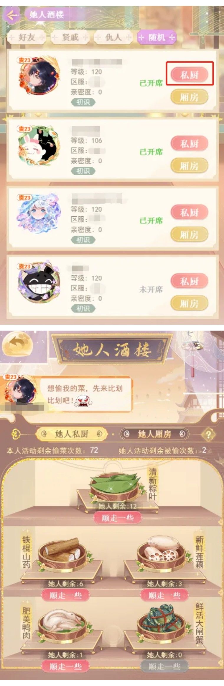 在此处,可顺走她人的食材,不过想要顺走别人的菜可是需要先比划比划,战斗胜利则可顺走她人的食材,战斗失败则顺取失败*她人在活动中被顺走菜的次数根据贵族等级是有限制的哦,达到上限后无法再顺取她的菜