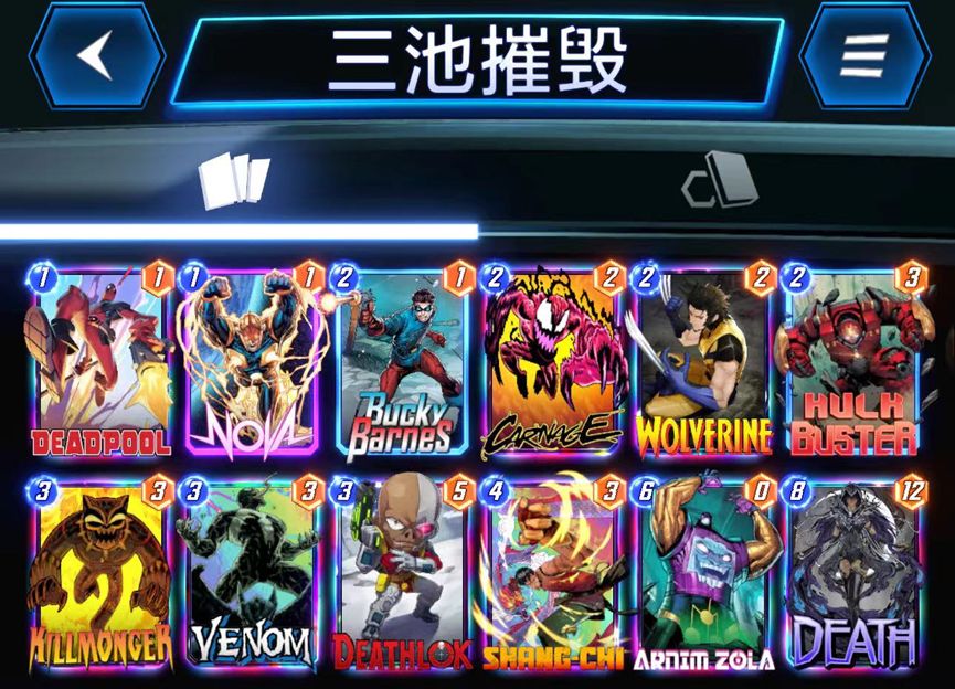打法介绍:这套卡组曲线比较平滑,1费2费3费卡牌就占了9张,前期几乎不可能卡手。卡组的摧毁组件较多,有卡耐基、齐尔蒙格、毒液、死灵锁和电视机(阿尼姆-索拉),主要战力点有3个,第一个是养死侍,第一回合有死侍打死侍,后续不断摧毁死侍把点数养大。第二个战力点是金刚狼,每次摧毁加2点战力。第三个点是毒液,毒液尽量在第五回合吃死侍或者金刚狼可以让点数最大化,第六回合可以打电视机在毒液路出两个大毒液。死亡女神尽量留到最后打让对手难以预判我方的点数。