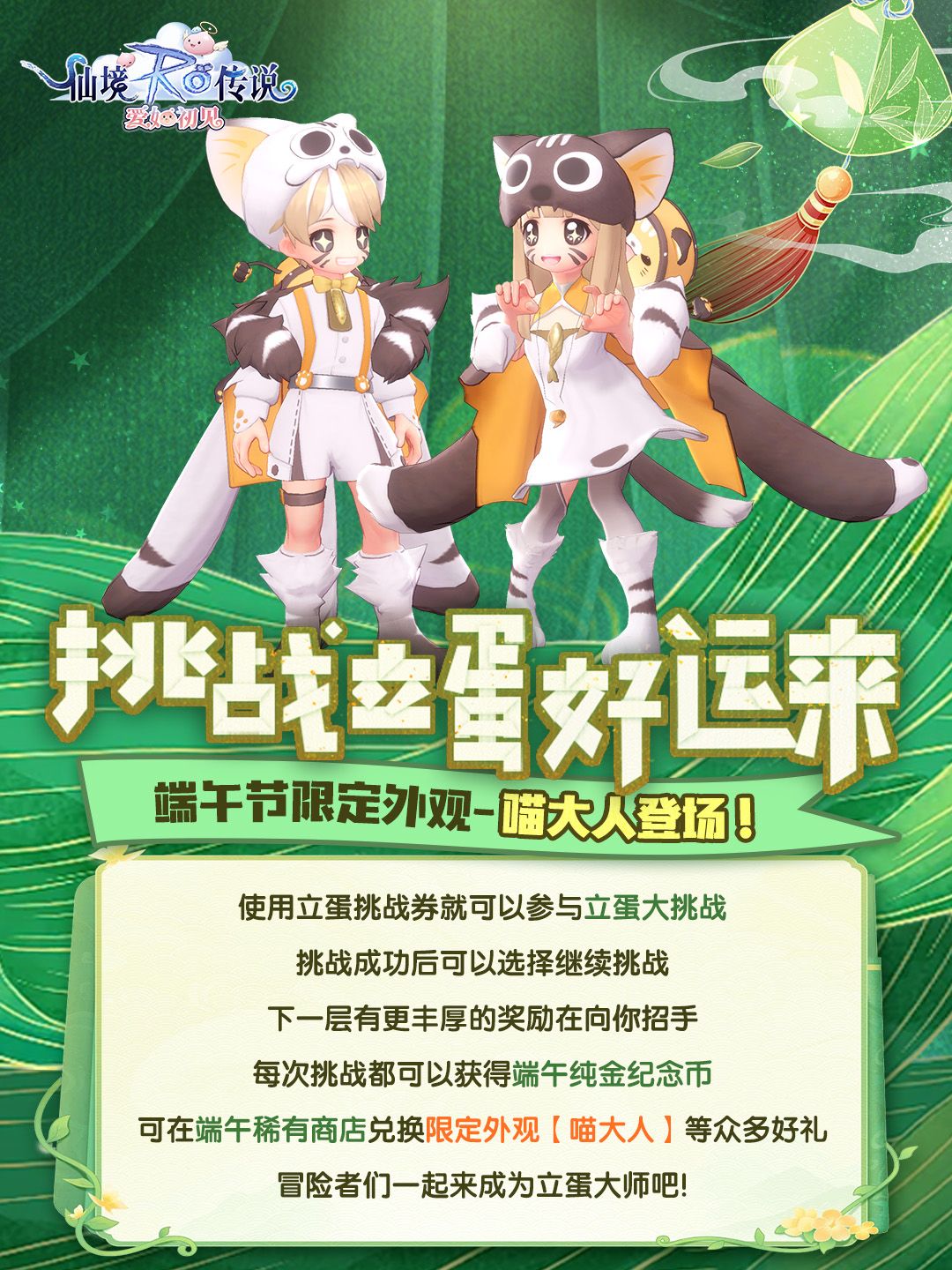 🐈【喵大人】套装已上线,整套包含:时装-喵大人,头饰-喵大人头套,脸饰-喵大人胡须贴纸,背饰-喵大人手摆鼓。更多细节请戳开大图查看噢~获取方式:使用立蛋挑战券参与立蛋大挑战获取端午纯金纪念币,可在端午稀有商店兑换限定外观喵大人等众多好礼!