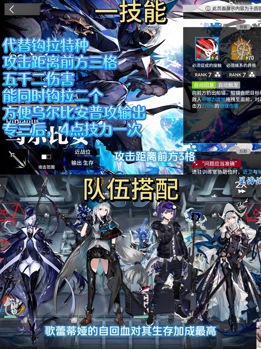 一技能,能让钩拉特种下岗了,攻击距离前方三格,造成五千二伤害,能同时钩拉二个,钩拉到面前,好方便,手短的乌尔比安普攻输出,专三后,4点技力一次