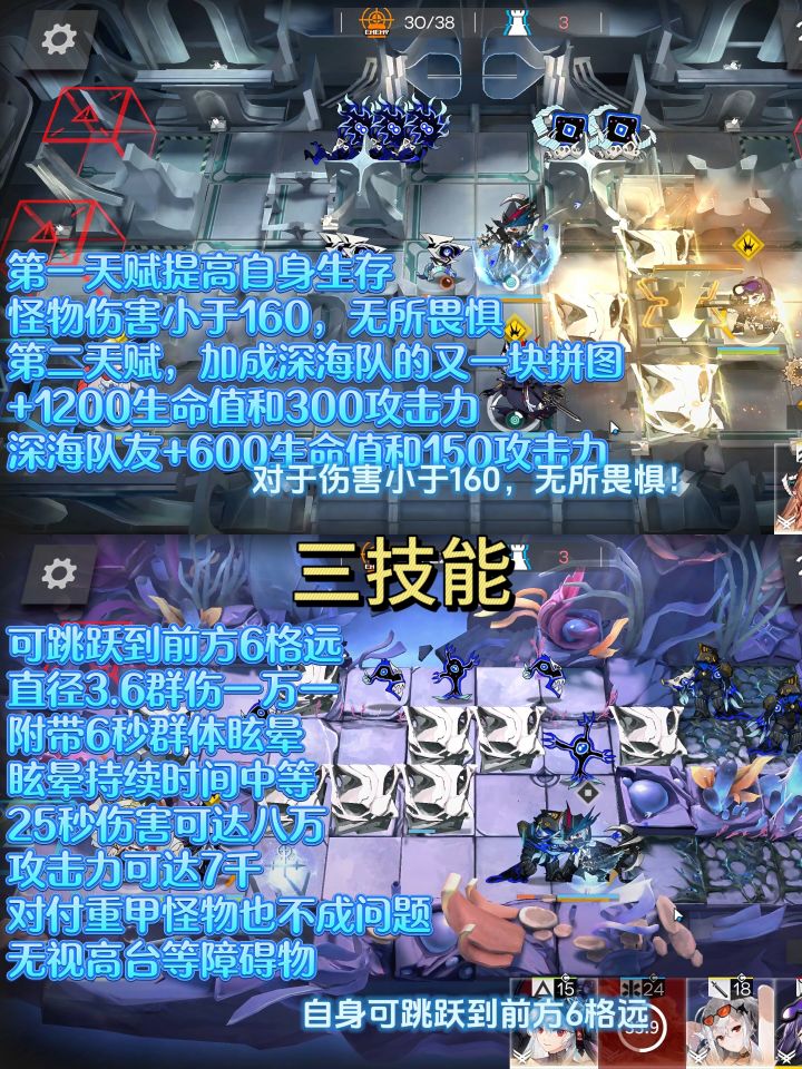 二技能,省事过图,提升输出和生存,技能持续时间无限,攻击力可达5千,阻挡变为三,输出效果好,可代替,煌等群攻近卫,来清怪,就是攻击距离短了一格,生命值提升到一万二,敌方伤害小于320就是给它挠痒痒,加个医疗后,战场生存里极强,专三七十技力进入水续技能