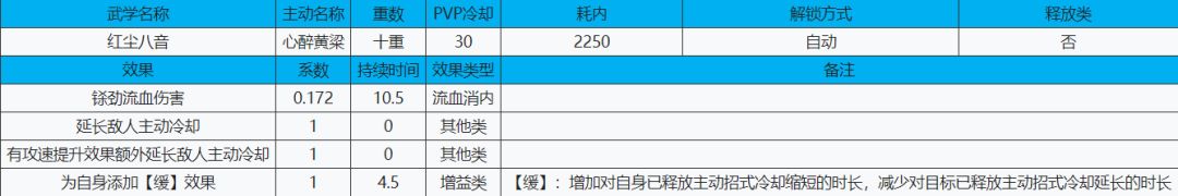 心醉黄粱主动1-3重时仅有铩劲流血伤害效果,4-6重时增加延宕,且有攻速增益时额外延宕效果,7-10重时才有【缓】buff。铩劲流血值单次为1131,总共造成6次流血。【缓】的效果目前除了给八苦增加伤害之外强化延宕的效果是比较鸡肋的,携带红尘八音之后内功和轻功位有延宕效果的,例如凌霄心法、藏狐步等武学,在强度上是有点一言难尽的,不如直接携带强力武学,放弃【缓】的强化延宕效果。与此同时,心醉黄粱作为延宕主动,可以被其他延宕主动影响,而不是像老武学的延宕主动一样无法被影响。