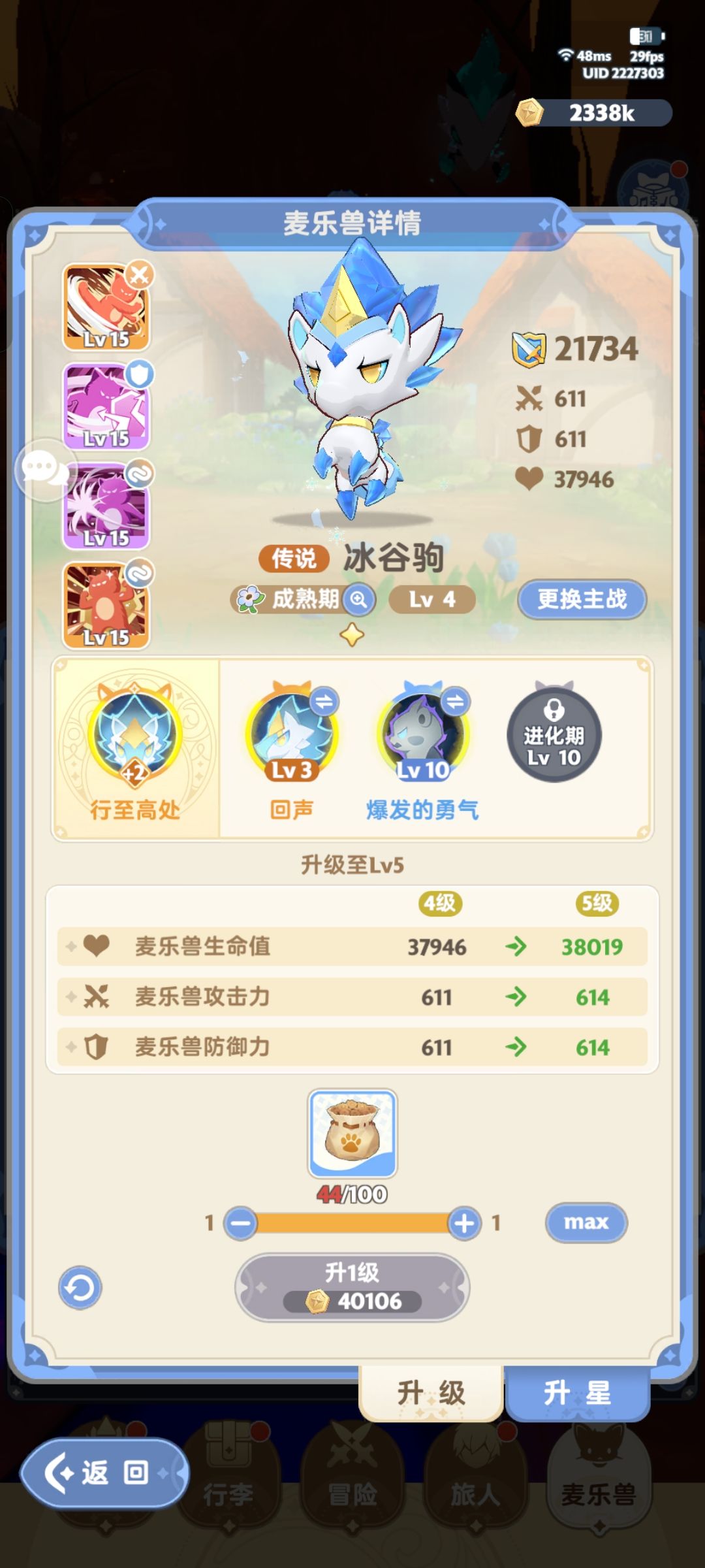 第二天,等级44,战力40k。今天宠物抽到120,两马外加歪了一只隼,虽然不是想要的但也是加强了推图吧nice。好消息是接下来50抽必出马。