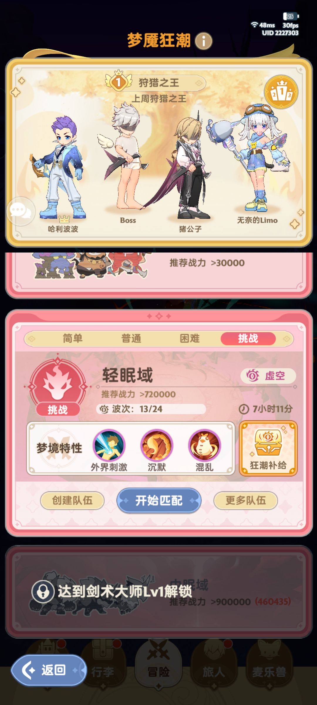 第十九天,等级54,战力465。宠物up要来了,加上三期礼包目前有150抽左右,该歪个好用点的特技了(许愿歪魔狗剑犬智谋多鸣雷声影中鸦之一,不难吧)个人玩法每期up保证两心愿就够,从积分上来看up期砖石抽宠物也是亏,3+2+2第三期也能保证金五,有30个橙闪缺口。今天开始不买装备突破石了,二转任务是肯定够了,每日资源开始443,三期保底要拿两次橙闪,需要6200分,问题不大。个人资源释放会在秘宝三轮和宠招两轮纸飞机上,前者保证战力后者保证输出。今天周日混了个挑战12,累了不折腾了。