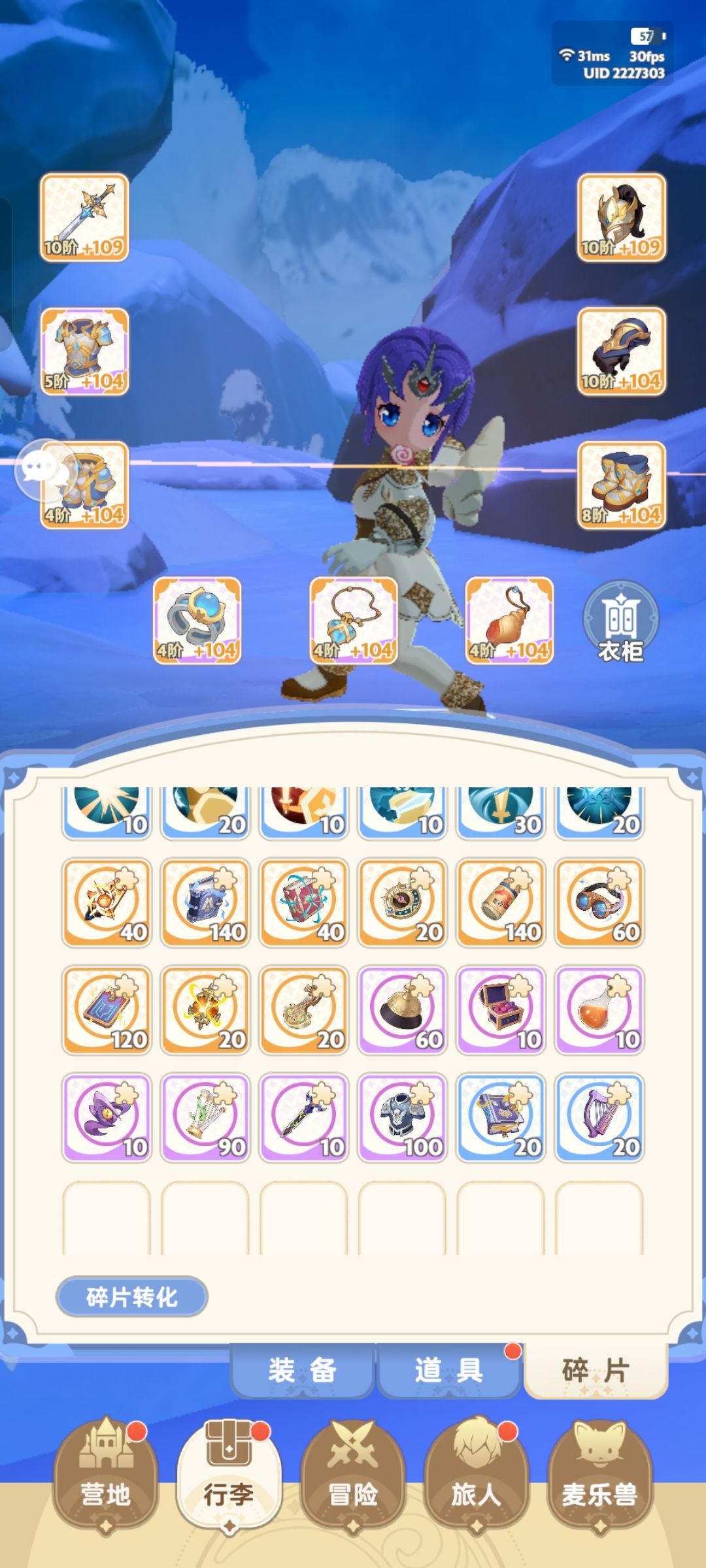 第八天,等级5,战力185,重金5400砖石买了30张时装卷。今天大概2500能源出了4金,倆重复,脸黑黑。武器7阶也是非洲水平。技能上裂地还是蓝色,今天起连续三天每天刷一次技能商店,不出紫拉倒等二期纸飞机。大暴走打到230阶报了大腿,明天起混个200阶奖励拿完就行。组人小技巧,180k金一输出>200k紫三输出。现在的匹配副本真恶心,基本上都是混子一堆蓝紫技能输出400比坦还低,只能等老区带,正常玩四个160k这个本就三分钟。各有各玩法吧开心就好。