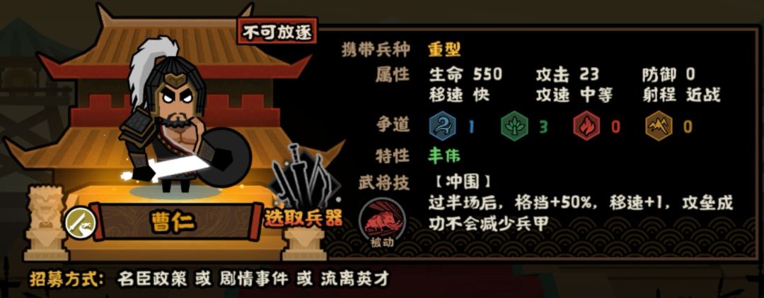 第二个部分是攻垒成功后不会减少兵甲,由于曹仁的兵种类型为战车,攻垒成功也只能造成1点攻城伤害,所以大部分情况下不值得用曹仁来攻城,加上效果限定在对垒战的模式,因此收益也比较有限。