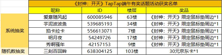 恭喜以上将军大人获奖,还请名单内的将军大人在开奖后的7个工作日内即6月26号之前,加入《封神:开天》玩家交流群:860840777,并私聊噗噗酱提供tap账号截图信息核对和登记奖品寄送信息。