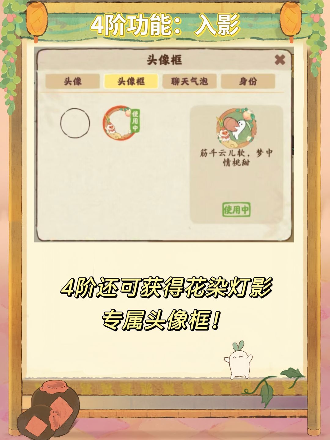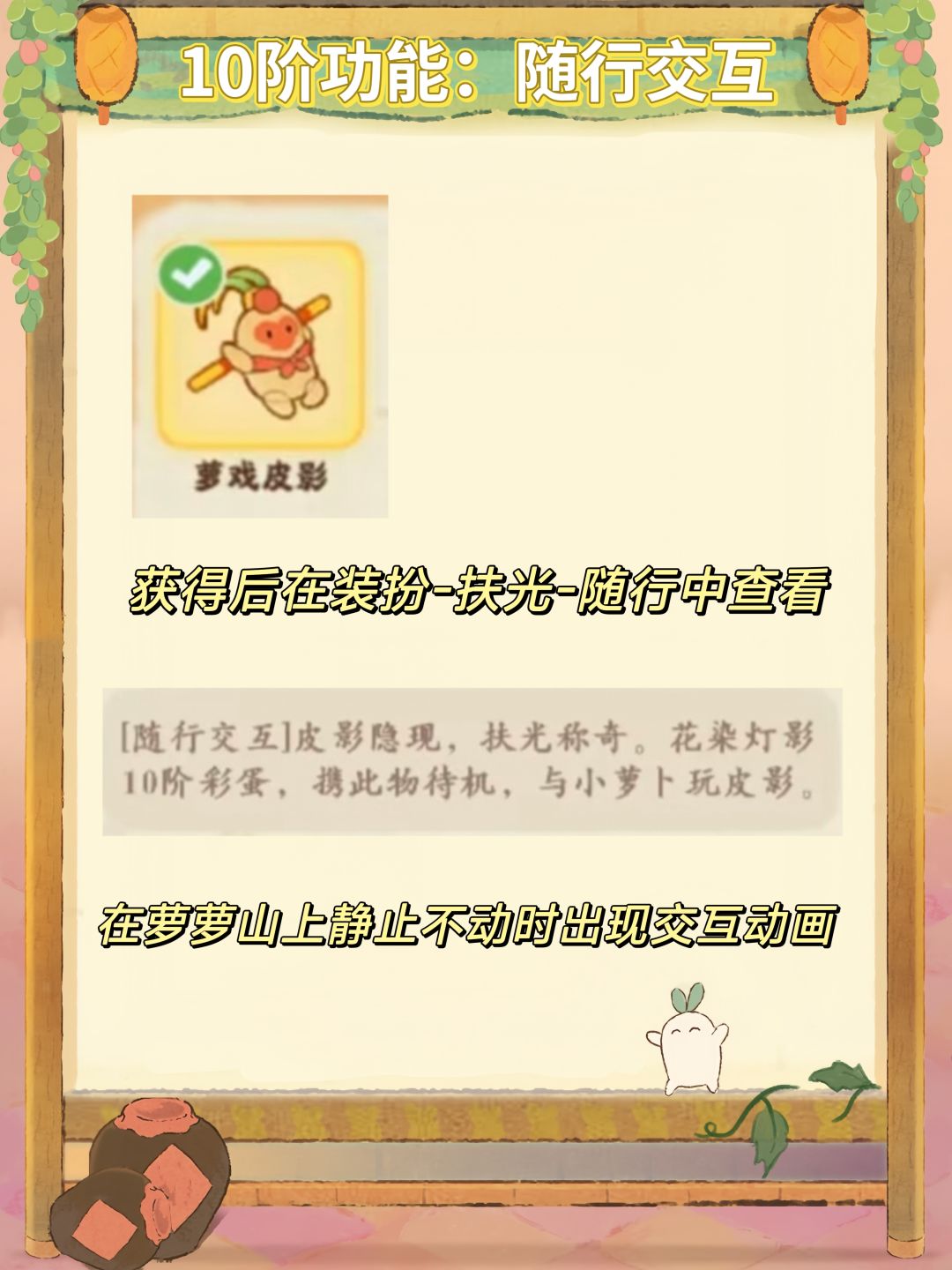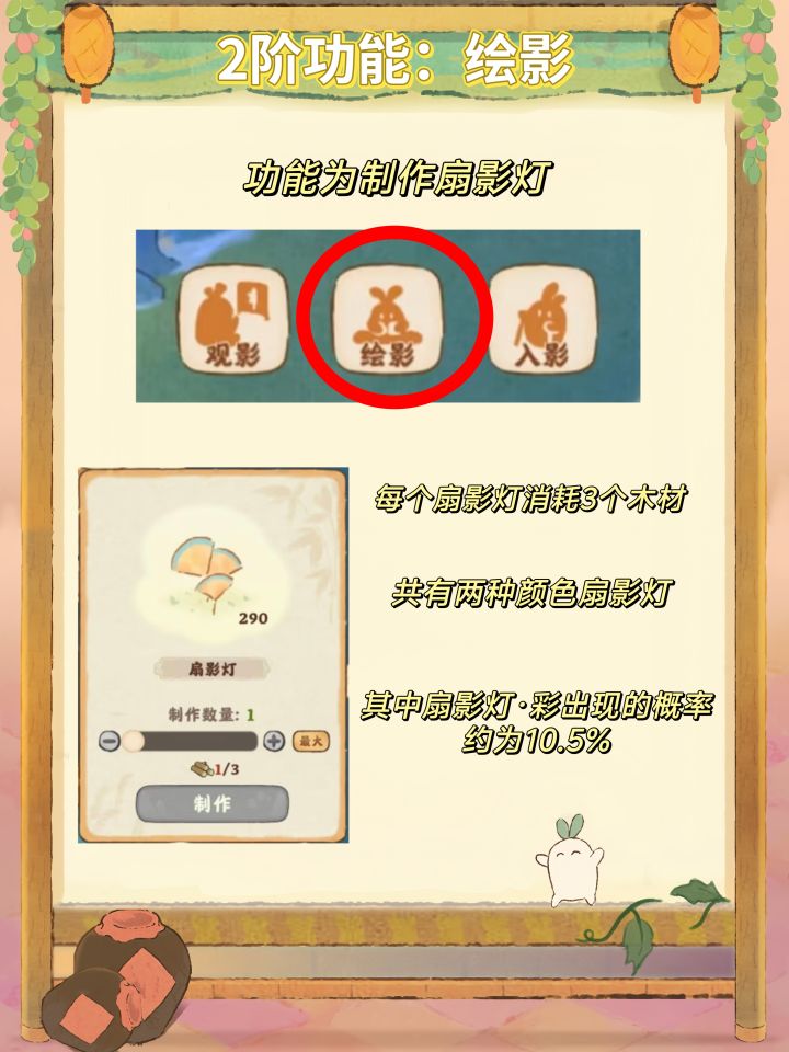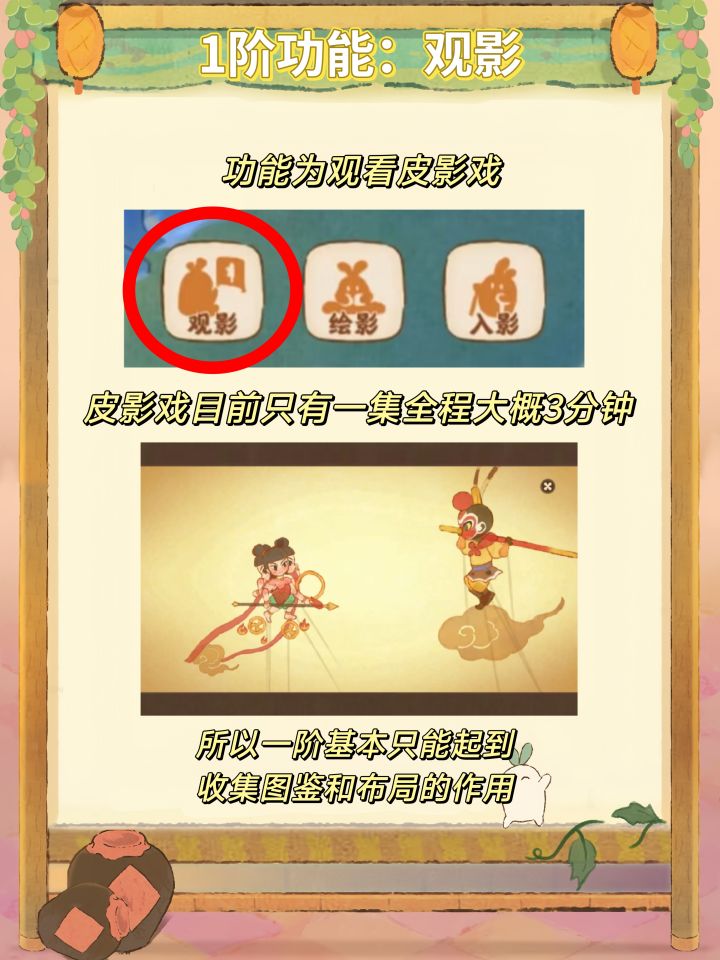 分析:可能看到花染灯影比较出彩的功能是扇影灯,小游戏除了彩蛋没有额外奖励,并且可以在别家获得和玩耍,而皮影戏目前只有一集,也只有三分钟。