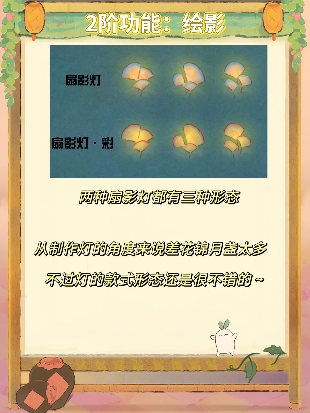 推荐:综上所述,最佳入手的阶级为2级,喜欢收集的玩家可以在二阶收集到两种灯和甲建筑本身的天工图鉴,而喜欢布局的玩家也可以在二阶获得两种适合各种夜景的扇影灯。1阶4阶较为鸡肋,10阶随行交互不明显。