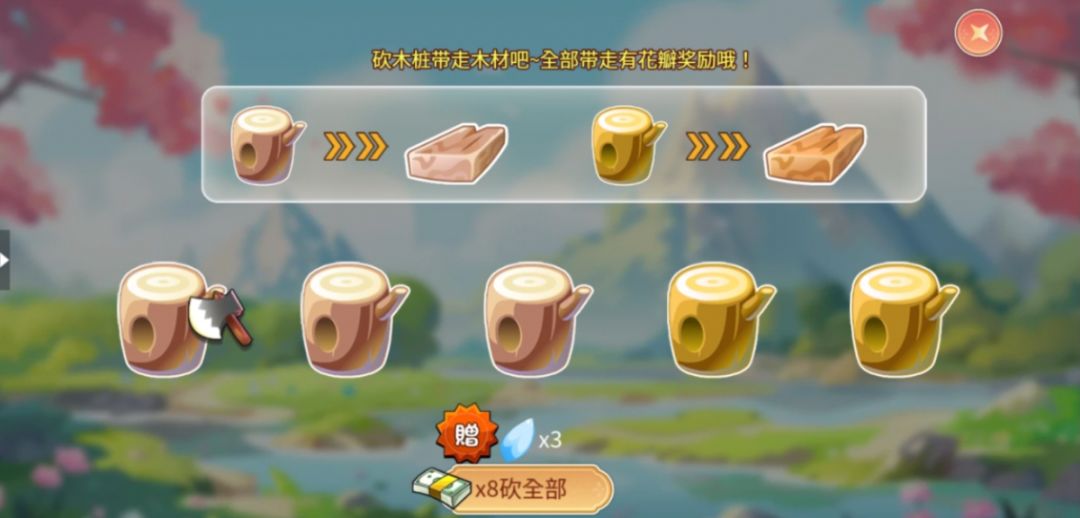 在砍木桩玩法中,点击对应木桩并消耗斧头进行砍伐,不同颜色的木桩砍伐后可以获得不同的木头。
