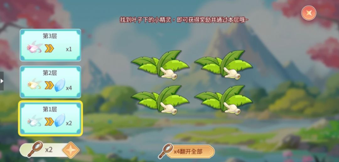 在寻找精灵玩法中,点击叶子翻找藏在下面的精灵,成功找到精灵即可进入下一层,本玩法中一共三层,每一层完成后可以获得额外的花瓣奖励哦。