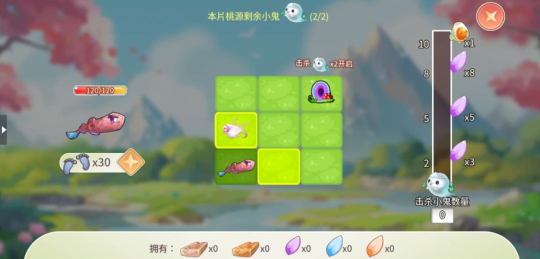 桃源中点击高亮的地块,让宝剑移动,在桃源中可以遇见木材、小鬼和精灵。