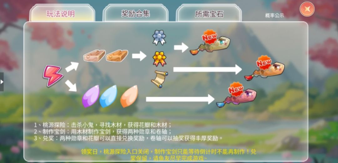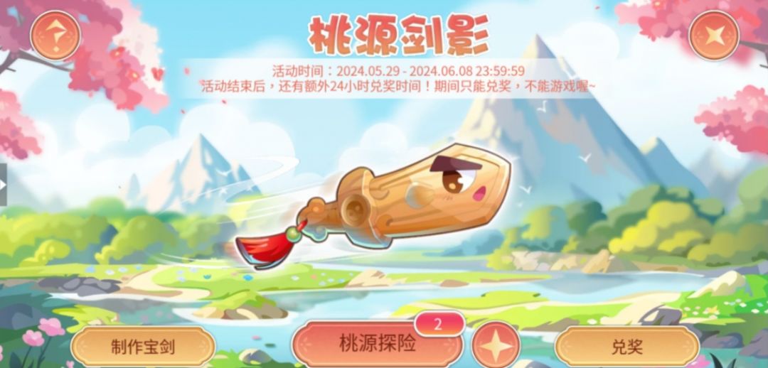 1、本活动分为三部分:桃源探险、制作宝剑、兑奖。