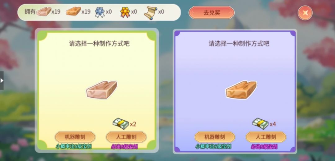 您可以选择机器雕刻或人工雕刻进行木剑制作,机器雕刻有小概率可以制作出S级宝剑,人工雕刻必出S级宝剑哦。宝剑制作完成后还可以获得勋章及卷轴奖励。