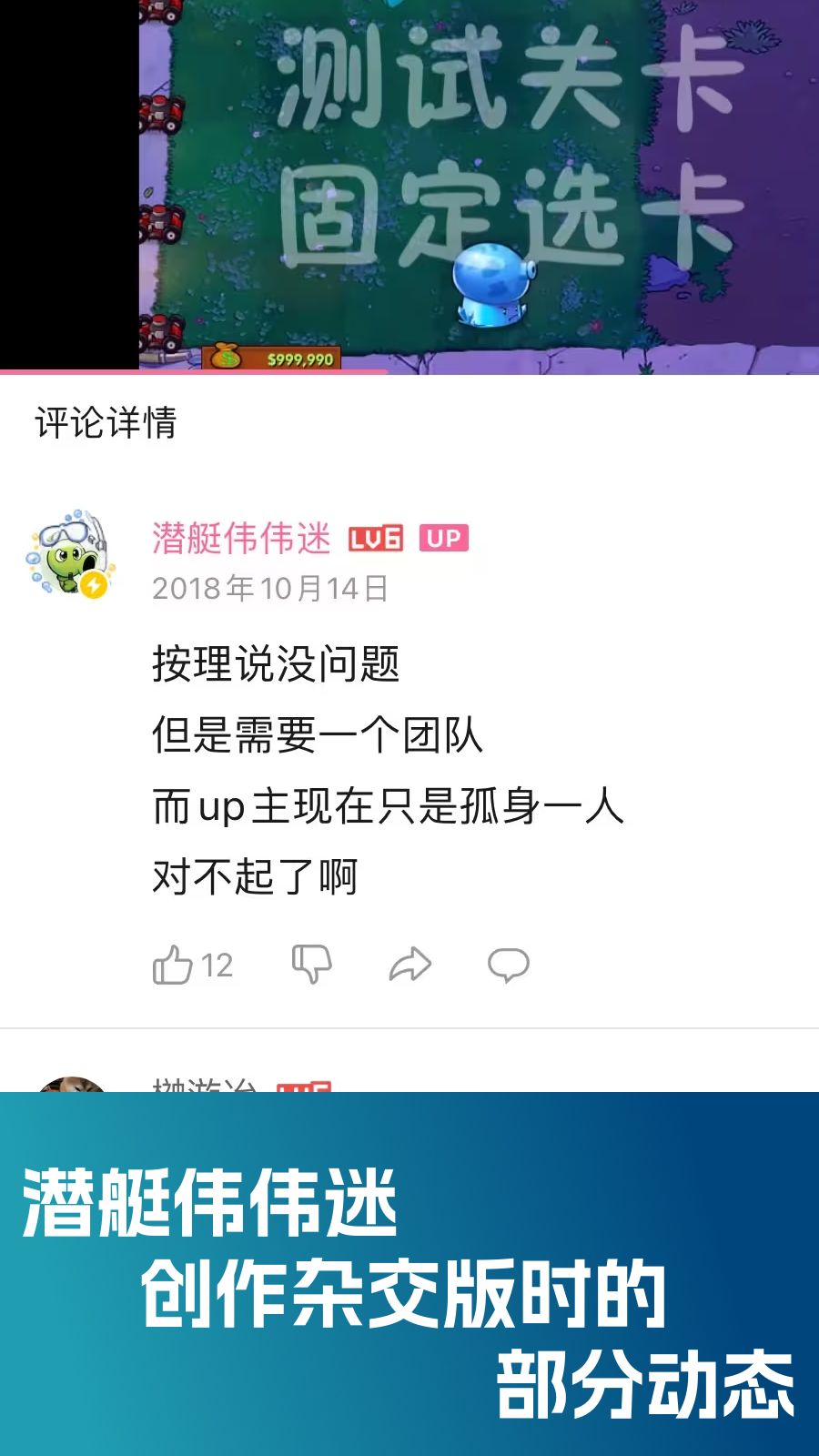 潜艇伟伟迷,从2018年开始更新自制植物视频,随着视频走红,关注潜艇伟伟迷的同好越来越多,终于还是有人发出了灵魂拷问——这么好玩的版本什么时候才能玩到?而受限于人力,潜艇伟伟迷一直是独自一人进行创作,制作自制版本的工程巨大,纵有满腔热血,却也只能默默回复一句对不起。但这句话,和他创作植物大战僵尸杂交版的梦想一起,深深烙印在他心里。