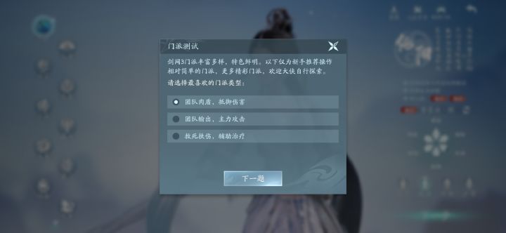 第二步,安装包下载完成后会登录然后选区服,选个自己顺眼的无界新区。然后选择门派,先找准自己定位,选择右上角的门派测试,完成3步选项会推荐门派。