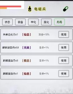 丹药界面如图所示,不同品级的丹药会增加不同的药抗以及炼体值,药抗为朱雀劣质200(麒麟为十分之一),普通160,优质120,完美80,极品60,仙品40,