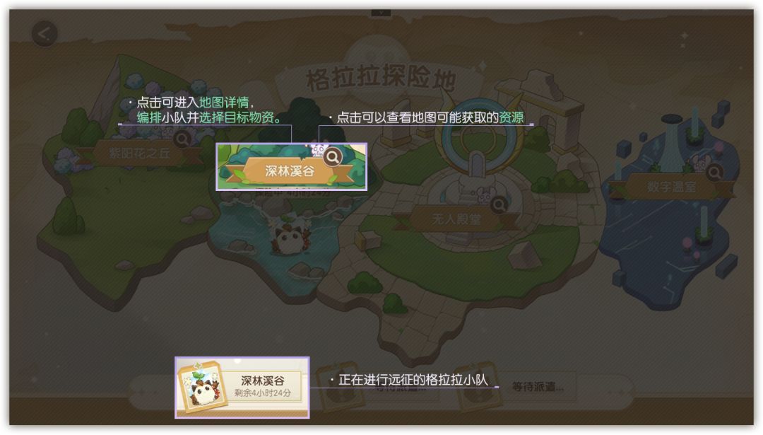 组建由1只格拉拉与4位角色组成的远征队,选定目的地后,经过一定现实时间即可收集到素材与道具!