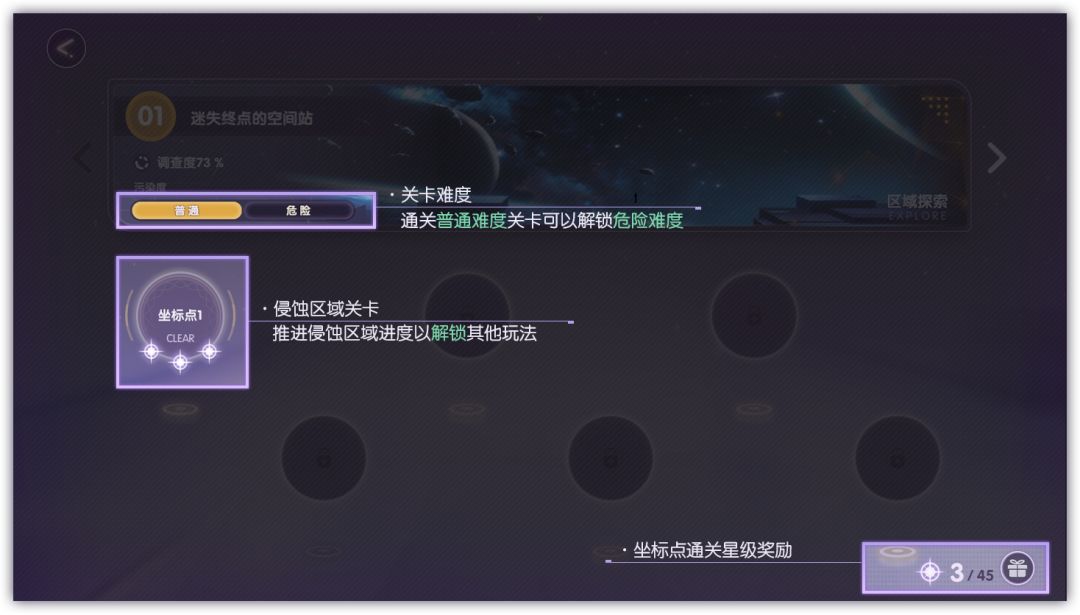 通关侵蚀区域的关卡,满足条件即可点亮「星级」。点亮一定的「星级」后可以获取额外道具奖励!